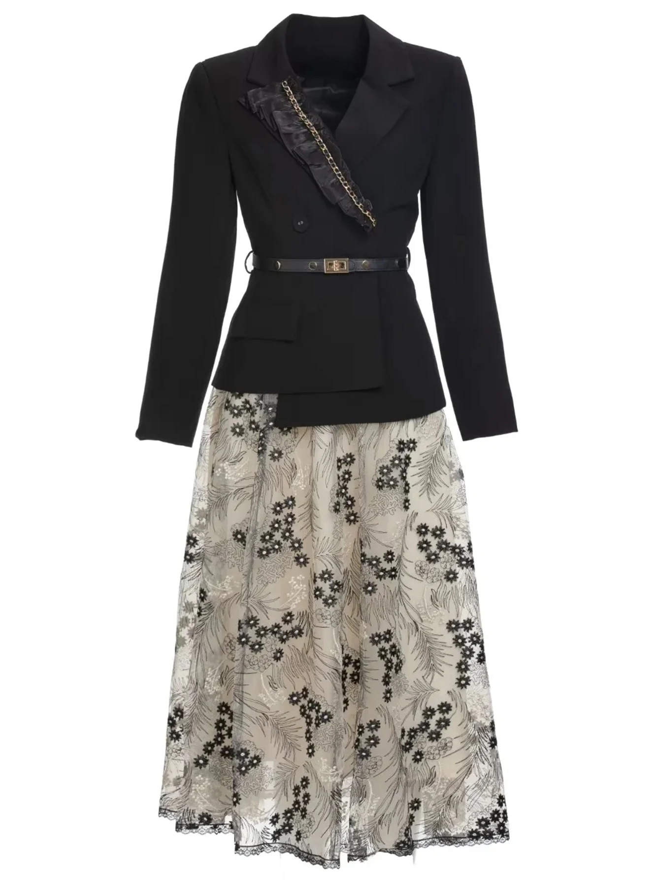 Ld Linda Della Fashion Runway Autumn Suit Women S Long Sleeve Sashes Black Blazer Mesh Embroidery Skirts Midi Two Pieces Set